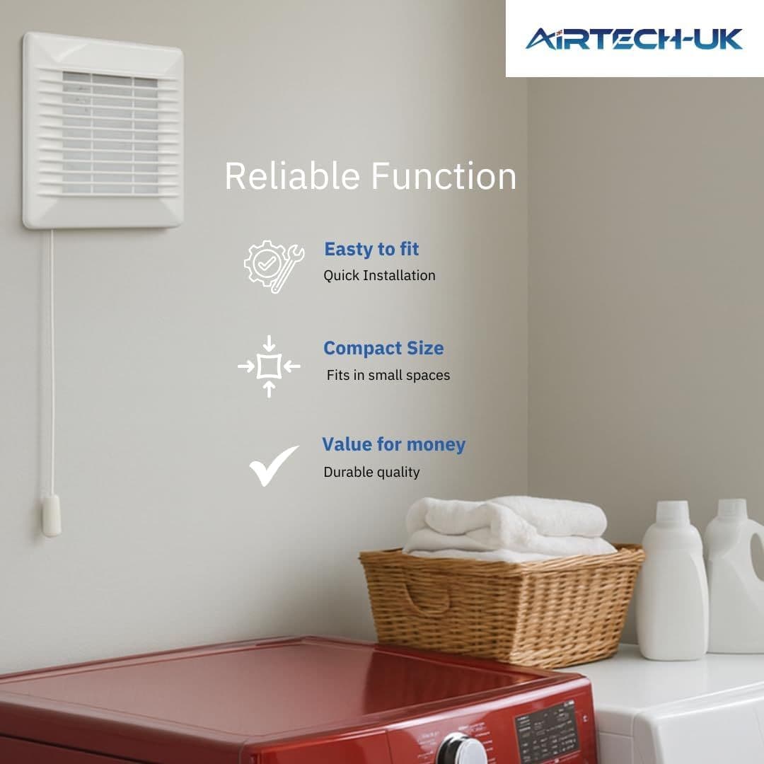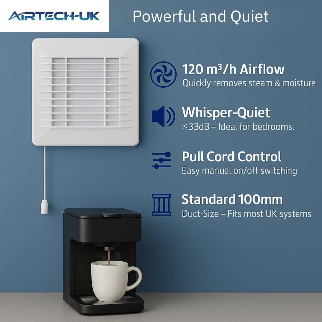 The AirTech-UK Bathroom Extractor Fan with Pull Cord is designed for efficient, quiet ventilation in bathrooms, kitchens, toilets, and utility rooms. With its compact 100mm (4 inch) design, automatic shutter, and modern finish, this wall-mounted fan is a practical and stylish solution for moisture and odour control.