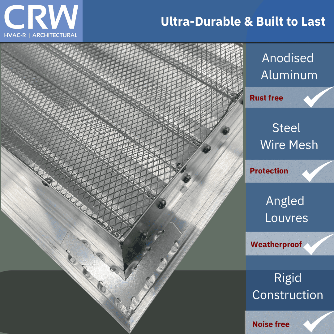 Common applications include ventilation of ducting, crawlspaces, utility rooms, plant rooms, and general airflow openings